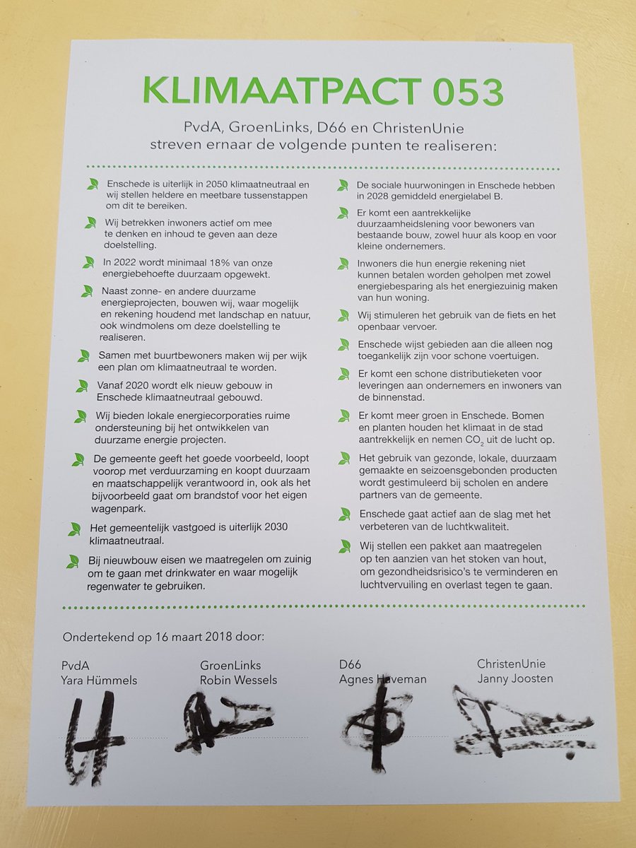vrijdag 16 maart 2018 18:00 Samen met Yara Hummels (PvdA), Robin Wessels (Groen Links) en Agnes Haveman (D66) heeft Janny Joosten het duurzaamheidsconvenant ondertekend.